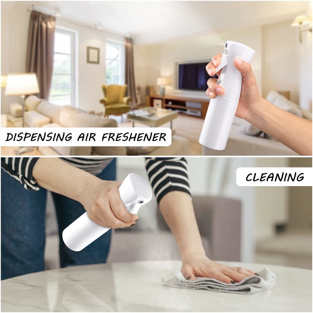 - Aerosol-Free Spray - Say goodbye to all the drip and puddles of liquid on the floor because your ordinary and improvised spray bottles can't handle the job! Say hello to DewyHaze™! This ultra-fine continuous mister dispenses an aerosol-like spray without using any pressurized containers or hazardous propellant gases. It is a great option for people who want to switch to a more mess-free, sustainable, and healthy option compared to aerosol spray bottles.