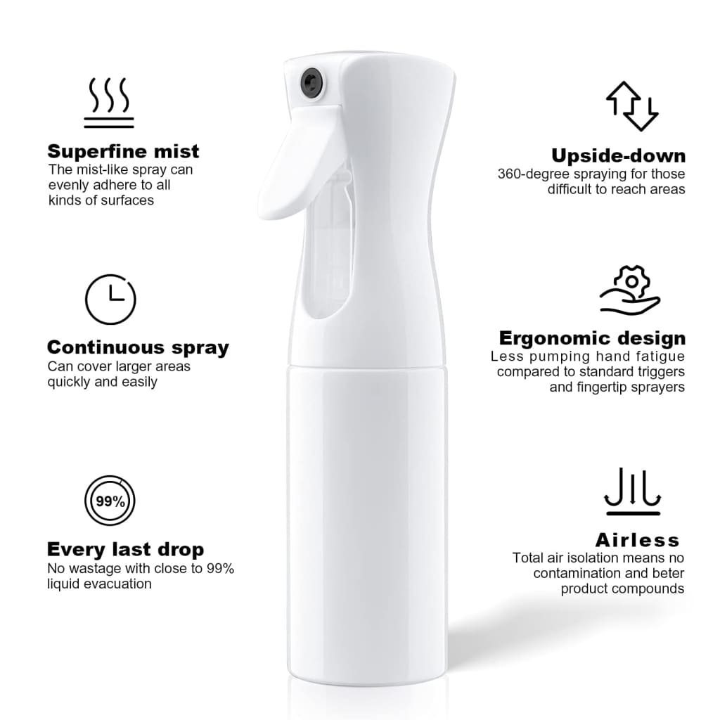- Ergonomic Design - Standard trigger bottles take multiple squeezes to get the spray started, but this 360-degree continuous mister releases a bust of fine and long lasting spray with just a gentle squeeze, with its ergonomic shape and easy-to-grip handle helping to reduce hand fatigue.