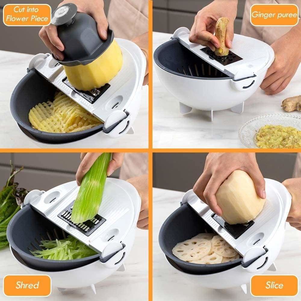 - 11 Functions, 1 Device - Julienne veggies effortlessly whether thick, thin, or fine, slice fruits easily whether thick, thin, or ridged, grate veggies or hard cheeses, wash and drain your produce, or just use it as a fruit basket!